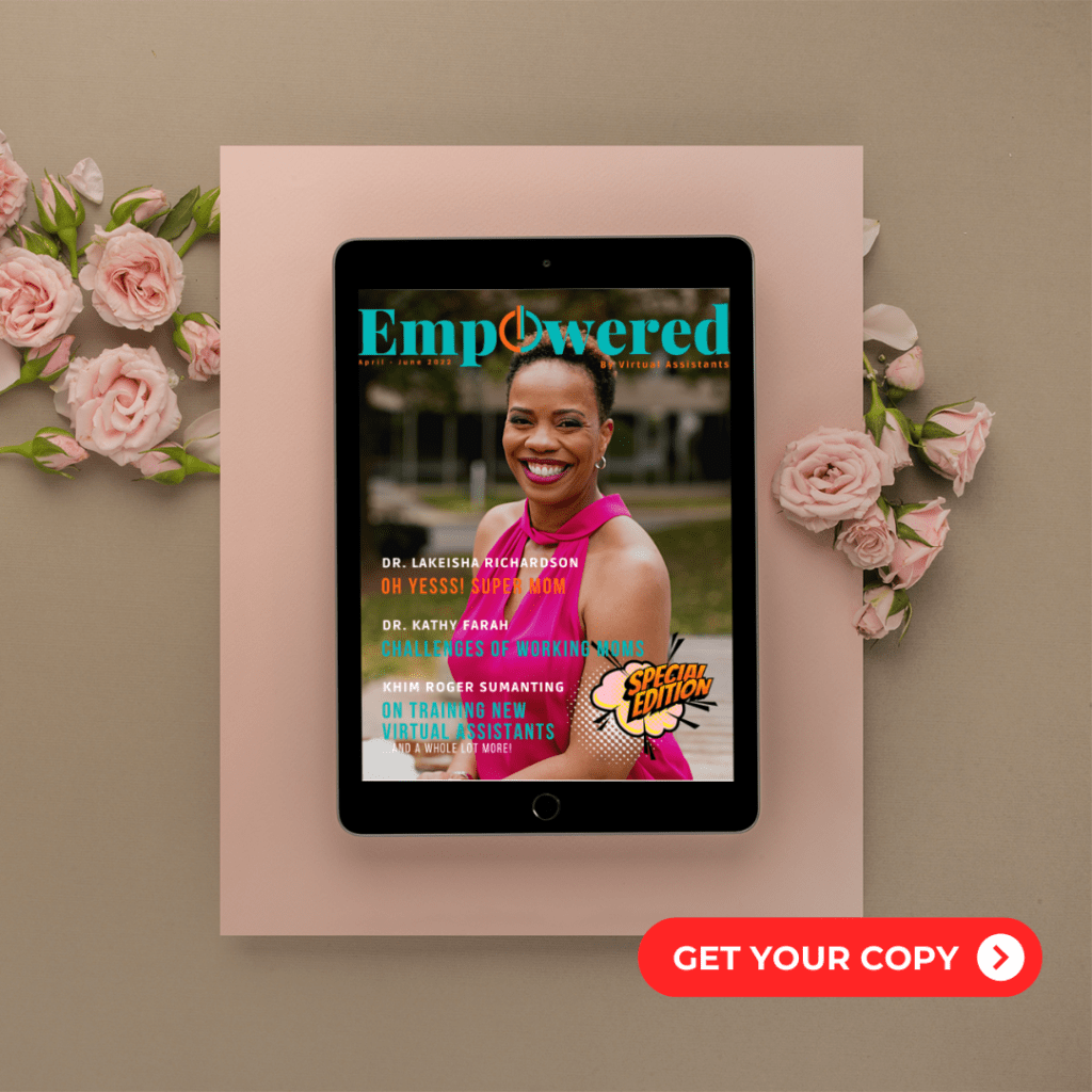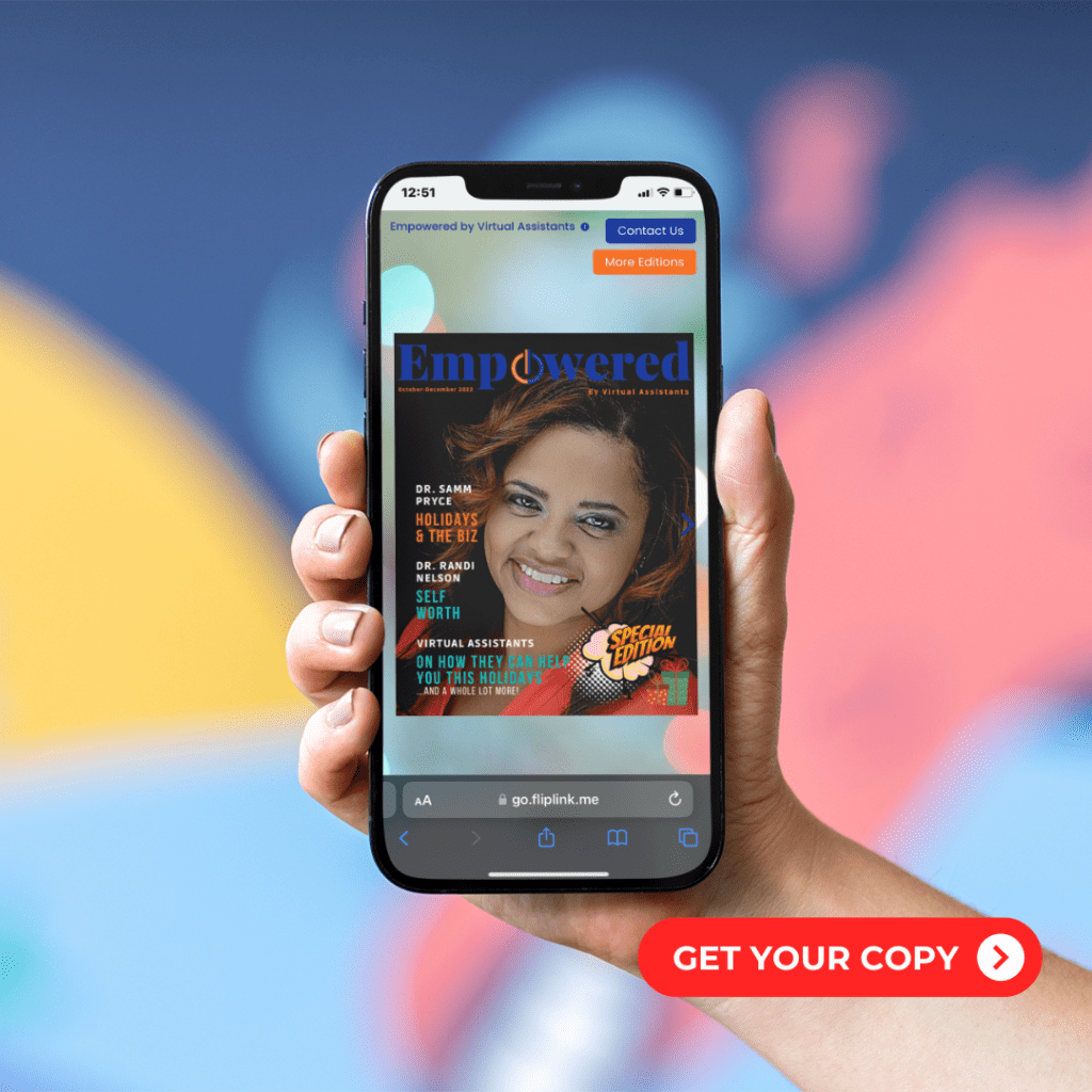 On the cover and featured inside is our pioneer client, Dr. Taunya Lowe. Truth be told, she is one of the three who trusted us during the early years of our foundation. She tells us of how her journey is changed by Virtual Assistants. More so, she offers a powerful combination of expert insights and inspiring stories! Empower yourself and your team for the holiday season.
